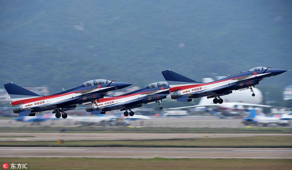 The 11th China International Aviation and Aerospace Exhibition soared over Zhuhai on Nov. 1, offering audiences an awe-inspiring show featuring performances by the Bayi (August 1st) Aerobatics Team of the PLA. The team has amazed various audiences with its delicate and complicated performance. Aerial aerobatics teams from Russia, Britain and Pakistan also wooed spectators, with Britain's Red Arrows giving their first ever performance at the air show. (Photo / People’s Daily)