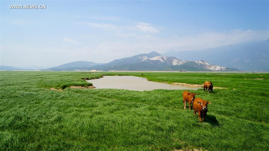 The Luixingdun island, once used as a navigation mark and lighthouse, was surrounded by expansive grass as cattle grazed in the field.