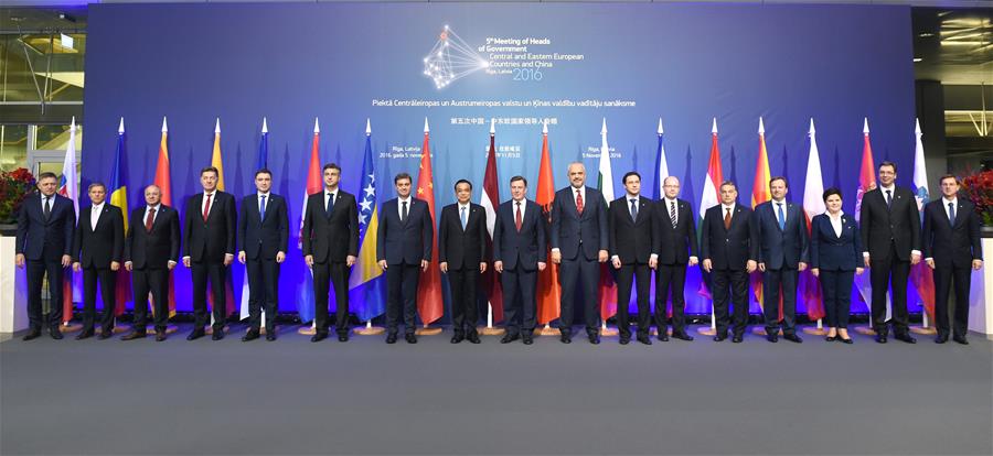 Chinese Premier Li Keqiang (8th L) and the heads of government of 16 Central and Eastern European Countries (CEEC) pose for a group photo during the Fifth Meeting of Heads of Government of CEEC and China in Riga, Latvia, Nov. 5, 2016. (Xinhua/Rao Aimin)