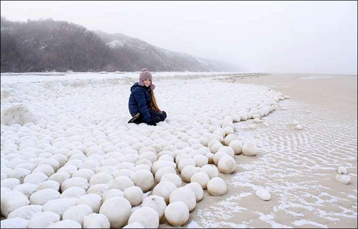 The snow balls are believed result from a rare environmental process where small pieces of ice are rolled by wind and water, and end up as giant snowballs.