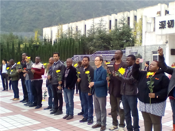 African journalists lay flowers at mausoleum for quake victims.[Photo provided for people.cn]