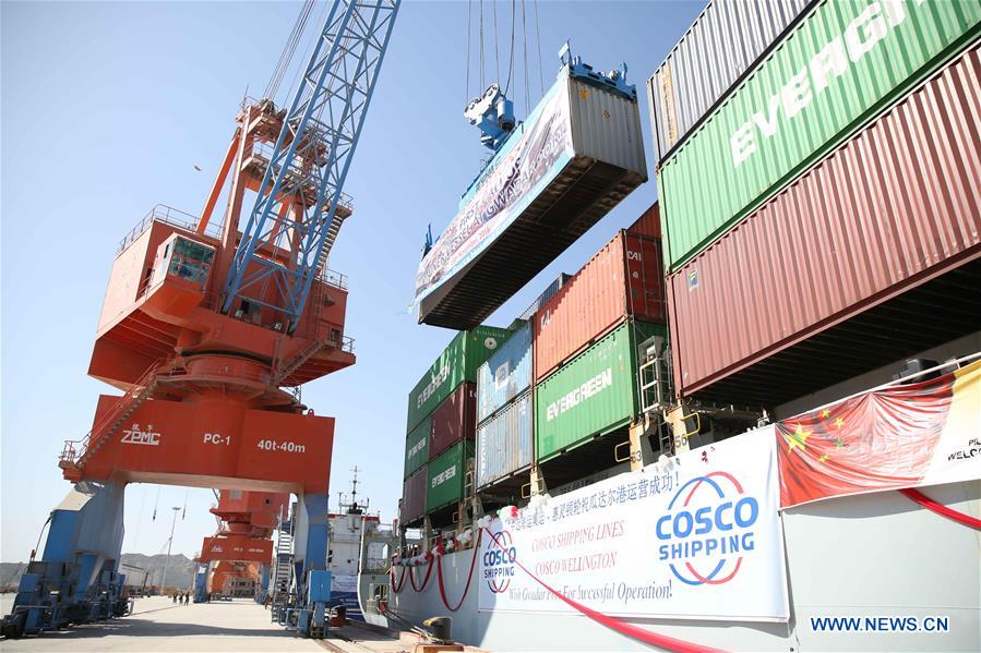 A container is loaded onto the COSCO Wellington cargo vessel in Gwadar, Pakistan, on Nov. 13, 2016. Gwadar port marked its first export of a large number of containers to overseas destinations, showing that the port has restored the designed handling capacity. (Xinhua/Liu Tian)