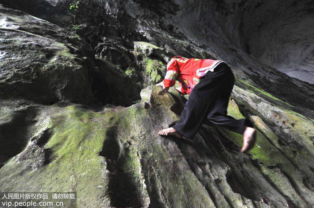 Huang Xiaobao, a 52-year-old resident of Ziyun, Guizhou province, climbs through caves to collect swallow feces and potassium nitrate, which he sells for money. Climbing skills have been passed down through seven generations of Huang's family. His extraordinary ability allows him to traverse steep mountain faces without protective equipment. The swallow feces he collects can be used as fertilizer, while the potassium nitrate is a crucial component for explosive materials. (Photo People’s / Daily)