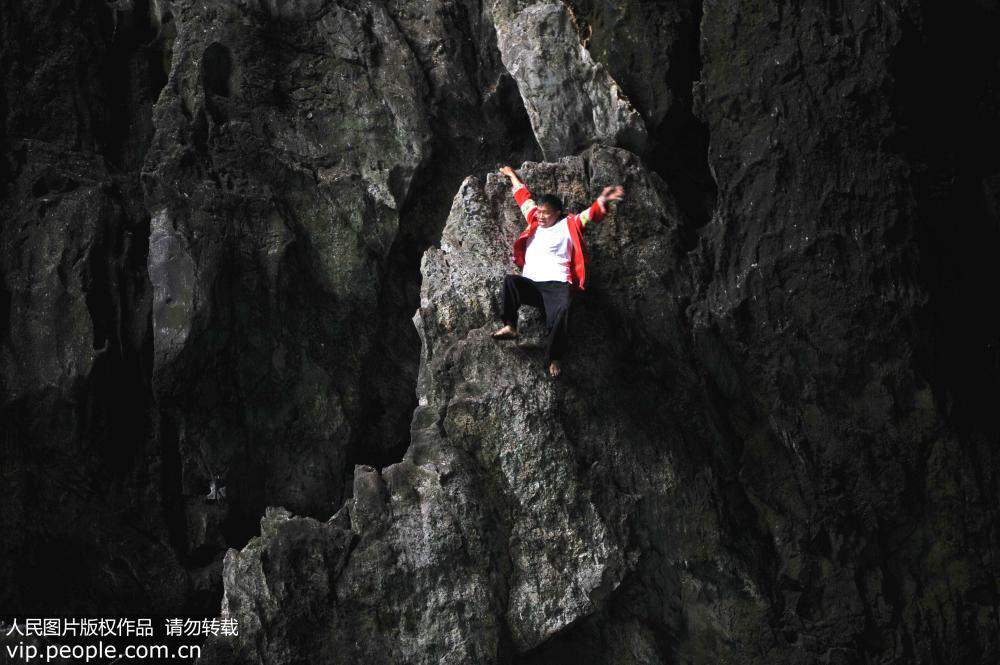 Huang Xiaobao, a 52-year-old resident of Ziyun, Guizhou province, climbs through caves to collect swallow feces and potassium nitrate, which he sells for money. Climbing skills have been passed down through seven generations of Huang's family. His extraordinary ability allows him to traverse steep mountain faces without protective equipment. The swallow feces he collects can be used as fertilizer, while the potassium nitrate is a crucial component for explosive materials. (Photo People’s / Daily)