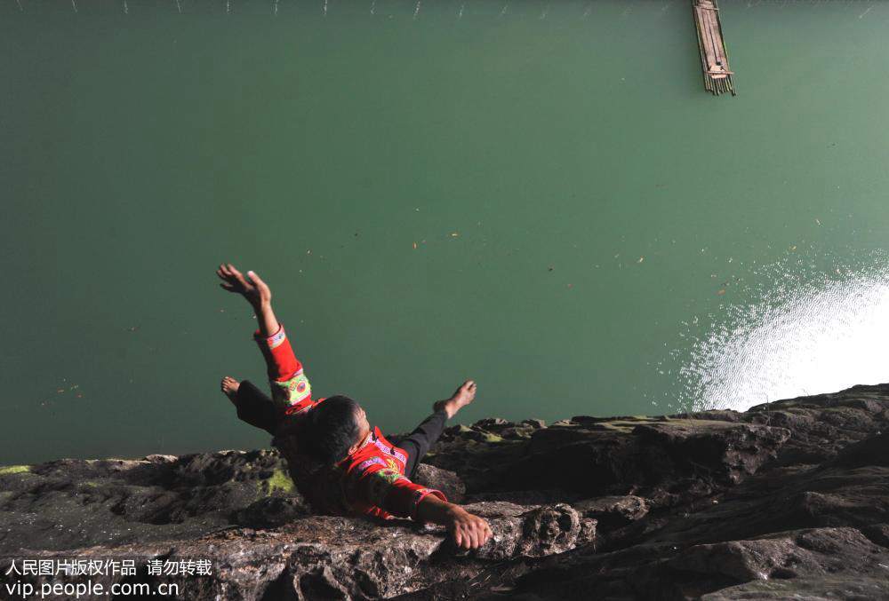 Huang Xiaobao, a 52-year-old resident of Ziyun, Guizhou province, climbs through caves to collect swallow feces and potassium nitrate, which he sells for money. Climbing skills have been passed down through seven generations of Huang's family. His extraordinary ability allows him to traverse steep mountain faces without protective equipment. The swallow feces he collects can be used as fertilizer, while the potassium nitrate is a crucial component for explosive materials. (Photo People’s / Daily)