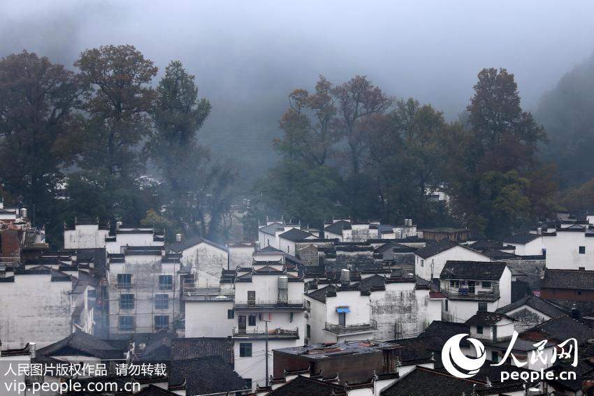 A traditional Chinese village in Wuyuan, Jiangxi province looms through a veil of milky fog, reflecting the radiance from scarlet maple leaves. The dark-tiled roofs, snow-white walls and delicately carved windows together create a harmonious picture, attracting visitors to enjoy the tranquil lifestyle. (Photo / Shi Guangde)