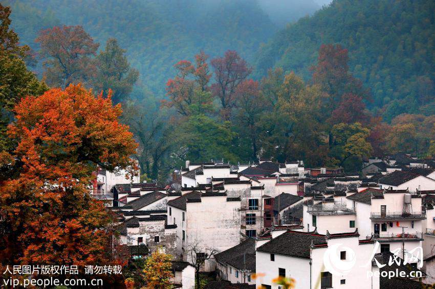 A traditional Chinese village in Wuyuan, Jiangxi province looms through a veil of milky fog, reflecting the radiance from scarlet maple leaves. The dark-tiled roofs, snow-white walls and delicately carved windows together create a harmonious picture, attracting visitors to enjoy the tranquil lifestyle. (Photo / Shi Guangde)