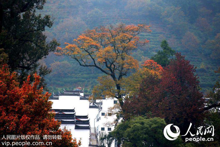 A traditional Chinese village in Wuyuan, Jiangxi province looms through a veil of milky fog, reflecting the radiance from scarlet maple leaves. The dark-tiled roofs, snow-white walls and delicately carved windows together create a harmonious picture, attracting visitors to enjoy the tranquil lifestyle. (Photo / Shi Guangde)