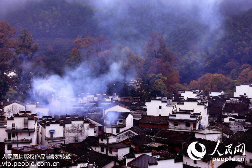 A traditional Chinese village in Wuyuan, Jiangxi province looms through a veil of milky fog, reflecting the radiance from scarlet maple leaves. The dark-tiled roofs, snow-white walls and delicately carved windows together create a harmonious picture, attracting visitors to enjoy the tranquil lifestyle. (Photo / Shi Guangde)