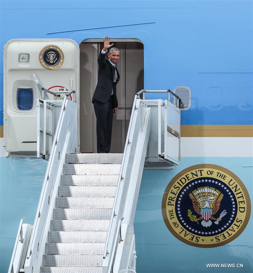 U.S. President Barack Obama waves as he boards Air Force One for departure at Tegel Airport in Berlin, capital of Germany, on Nov. 18, 2016. U.S. President Barack Obama left Berlin on Friday, ending his last visit to Germany and Europe during his term of office. (Xinhua/Shan Yuqi)