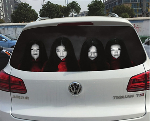 For some Chinese motorists have taken it to new extremes to stop drivers from using their full-beam headlights - by sticking pictures of creepy children in their rear-view mirror.