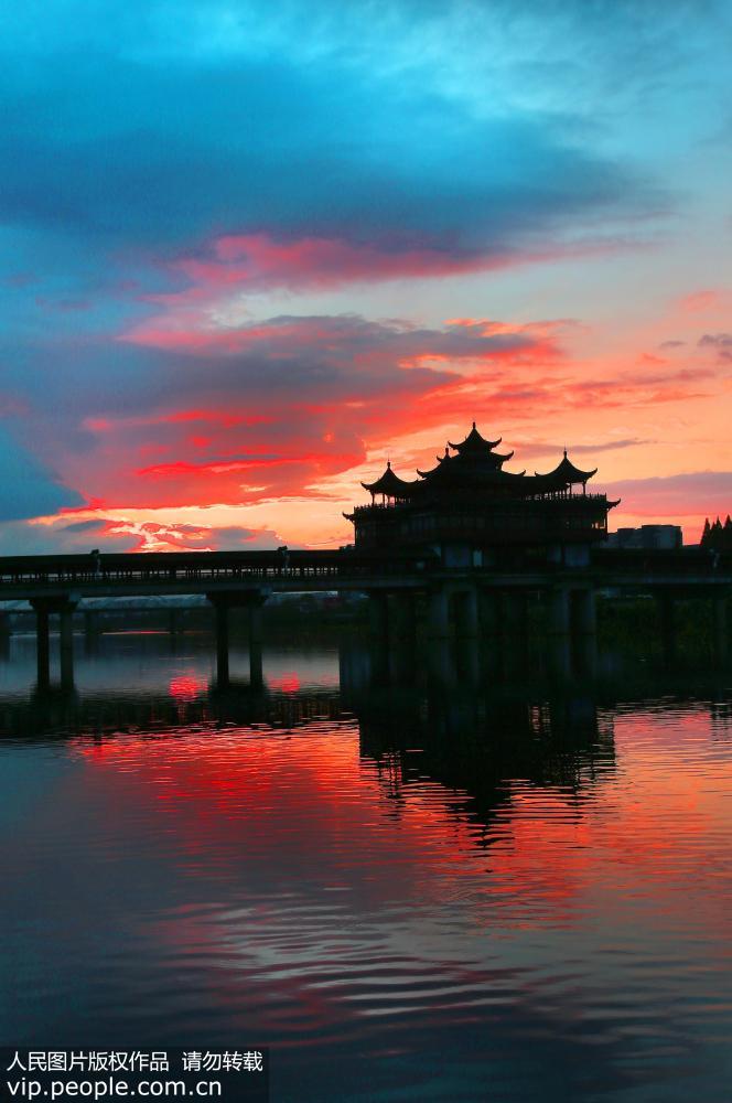 A crimson glow ignited the night sky in Xinjiang, Anhui province on Nov. 21. Due to the sudden drop in temperature, a flaming cloud shrouded the city, reflecting its glowing radiance on the inky-blue sky. (Photo / Shi Guangde)