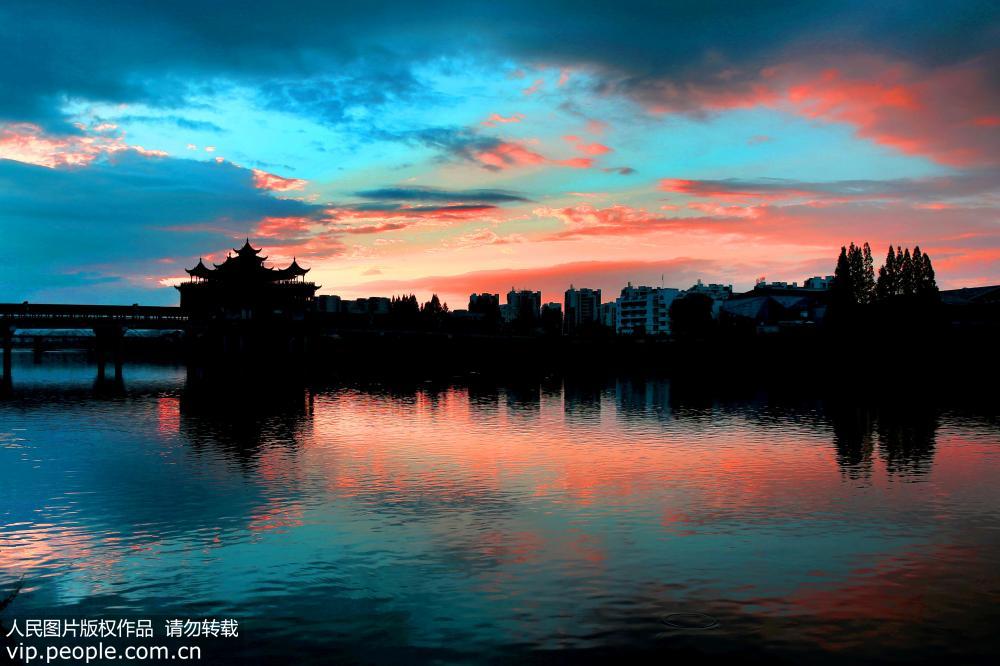 A crimson glow ignited the night sky in Xinjiang, Anhui province on Nov. 21. Due to the sudden drop in temperature, a flaming cloud shrouded the city, reflecting its glowing radiance on the inky-blue sky. (Photo / Shi Guangde)