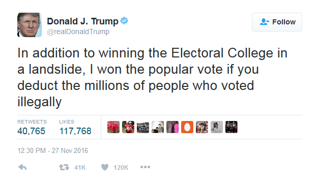 The latest totals have Hillary Clinton leading Trump in the popular vote by more than two million, but Trump refuses to accept the results as legitimate. Trump tweeted on Sunday, “I won the popular vote if you deduct the millions of people who voted illegally,” referring to the vote recount effort in Wisconsin, Michigan, and Pennsylvania. He did not provide evidence to back up that claim.