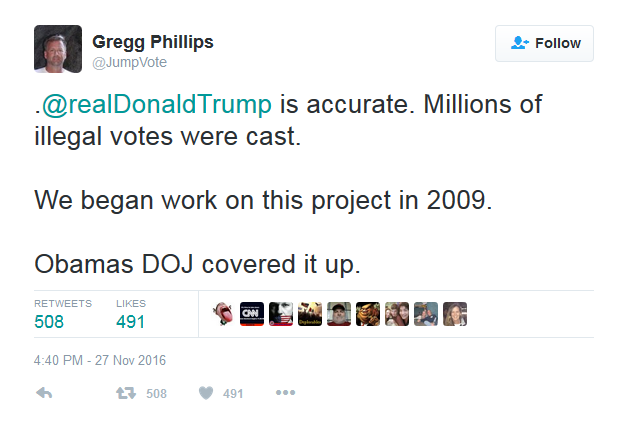 The Washington Post examined the claim made by Phillips before it became a statement made by the next U.S. president. The Post found no evidence that millions of people voted illegally in the election and called Trump’s claim bogus. Phillips has also refused to provide evidence to back up his claim, but he continues to defend it. “Millions of illegal votes were cast,” he wrote in response to Trump’s claim on November 27. “We began work on this project in 2009,” he added.