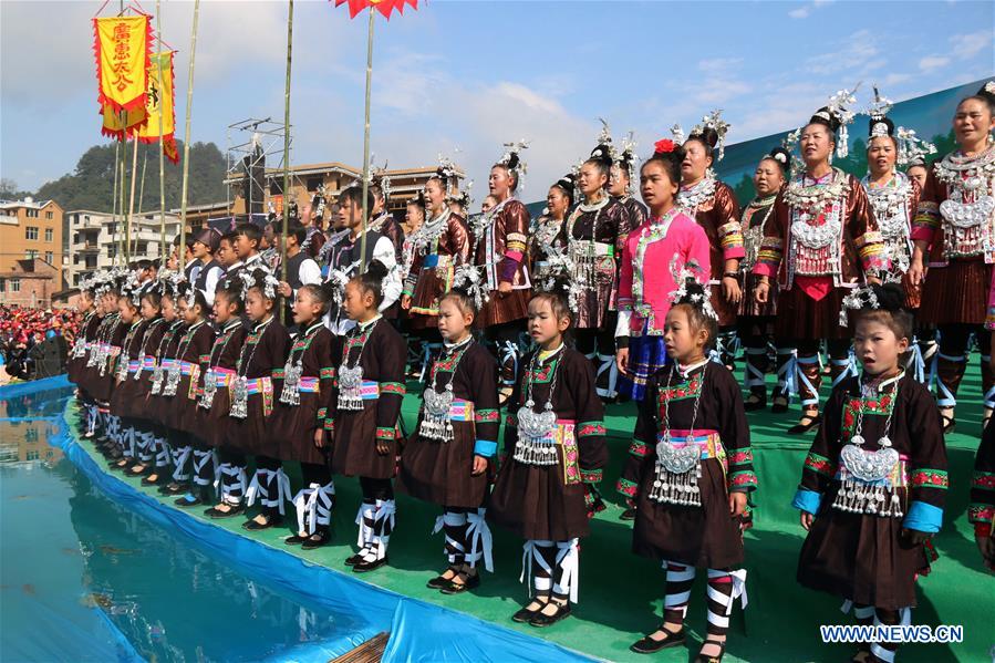 People of Dong ethnic group perform during a celebration of Dongnian festival, a traditional festival for harvest and gathering, in Liping County, Qiandongnan Miao and Dong Autonomous Prefecture of southwest China's Guizhou Province, Dec. 1, 2016. (Xinhua/Yang Daifu)