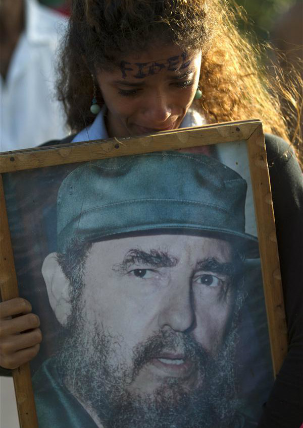 A woman holds a poster of Cuban revolutionary leader Fidel Castro during the passage of his funeral cortege to the Santa Ifigenia Cemetery in the city of Santiago de Cuba, Cuba, on Dec. 4, 2016. The remains of the Cuban revolutionary leader and former President Fidel Castro were buried Sunday morning at the Santa Ifigenia cemetery in Santiago de Cuba. (Xinhua/David de la Paz)