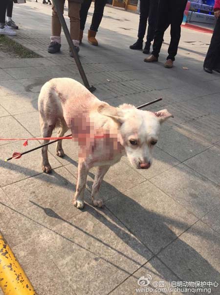 The arrow cut into the dog’s body from its left foreleg through the back of its head. The arrow was about one meter long and had no arrowhead. The dog’s abdomen and leg were stained with blood, Chongqing Morning Post reported. The web user told the newspaper that she had no idea whether it was a stray dog, but the wound appeared to have been deliberately inflicted.