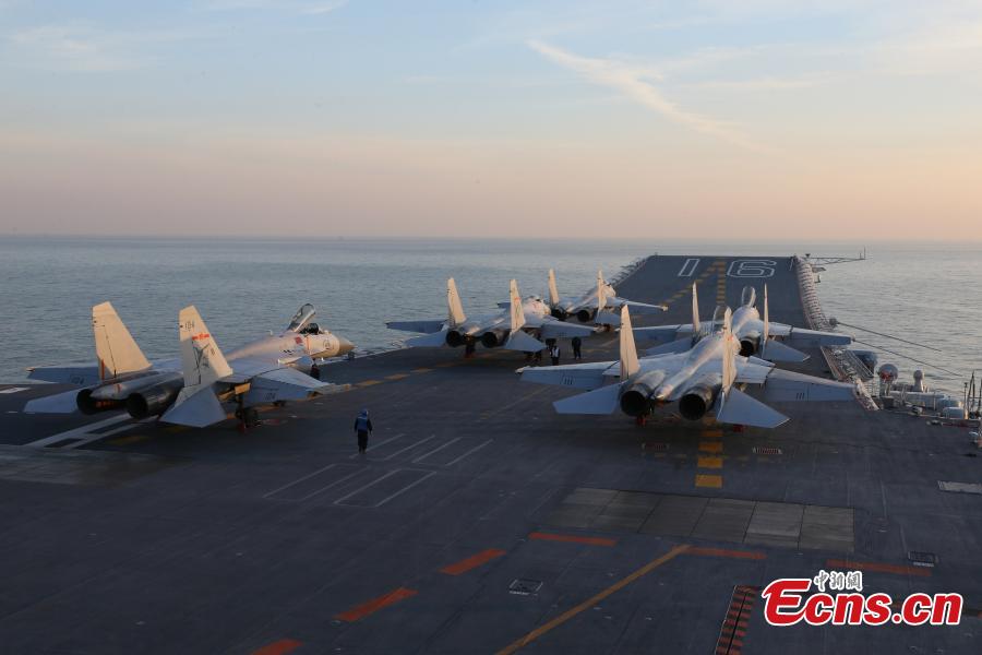 The Chinese Navy recently conducted a drill for a large fleet of naval vessels and aircraft including aircraft carrier Liaoning in the Bohai Sea, according to military sources on Thursday, December 15, 2016. In formation with several destroyers and frigates, the Liaoning carried out training in reconnaissance and early warning systems, air interception, sea assault, air-defense and anti-missile exercises. Carrying live ammunition, several batches of J-15 carrier-based aircraft had performed strike exercises. (Photo: China News Service/Mo Xiaoliang)
