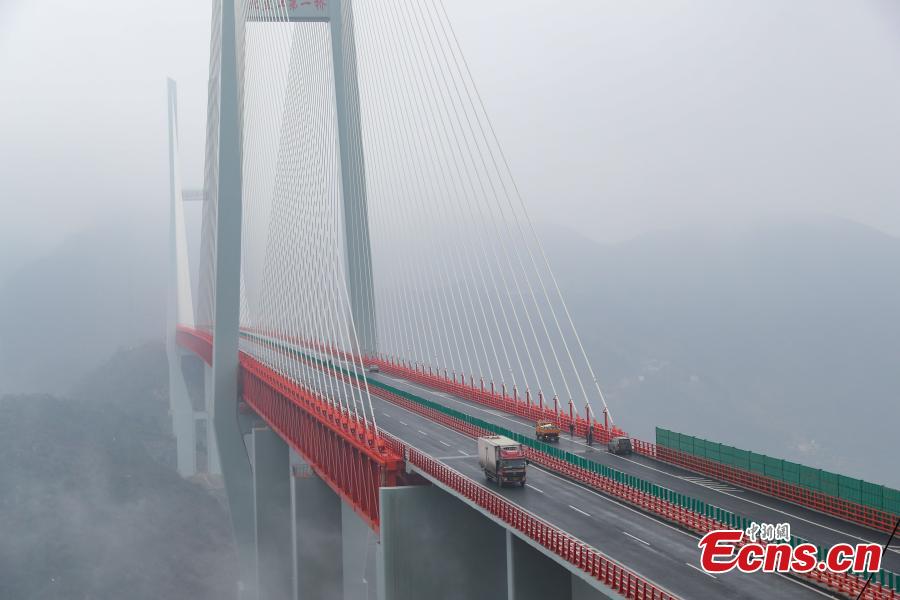 An aerial view of the Beipanjiang Bridge connecting Guizhou and Yunnan provinces, Dec. 28, 2016. As the world’s highest bridge, it soars 565m above a river and opens to the public on Thursday. The bridge cut road trips from Liupanshui in Guizhou to Xuanwei in Yunnan from over four hours to less than two. (Photo: China News Service/He Junyi)
