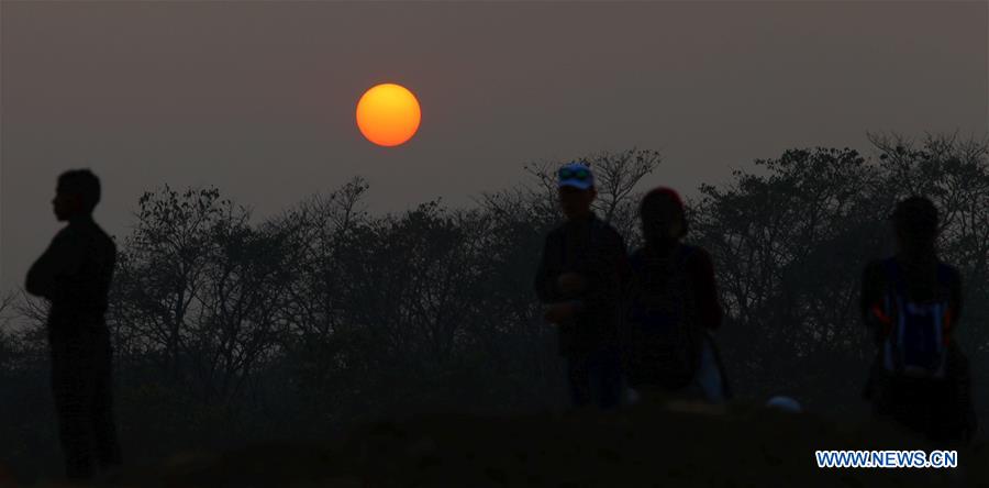 People enjoy the last sunset of the year 2016 at the bank of Rapti river in Sauraha, a tourism hub in southwest Nepal's Chitwan district, Dec. 31, 2016. (Xinhua/Sunil Sharma)