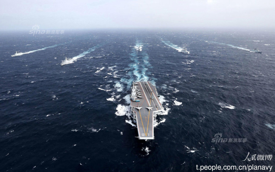 An aerial view of the Liaoning, China's first aircraft carrier, in the South China Sea during a training mission on January 2, 2017. [Photo: t.people.com.cn]