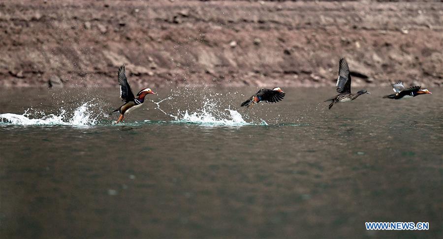 Mandarin ducks are seen at their winter habitat in Tianhu Lake of Ningqiang County, northwest China's Shaanxi Province, Jan. 17, 2017. (Xinhua/Tao Ming)