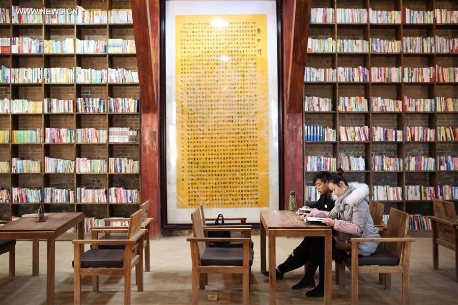 Tourists read books at a cave dwelling library in Mogou Village of Mengzhou City, central China's Henan Province, Jan. 19, 2017. The cave dwelling library, covering an area of about 4,000 square meters, comprises more than 50,000 volumes. It is opened to the public for free. (Xinhua/Zhang Cheng)