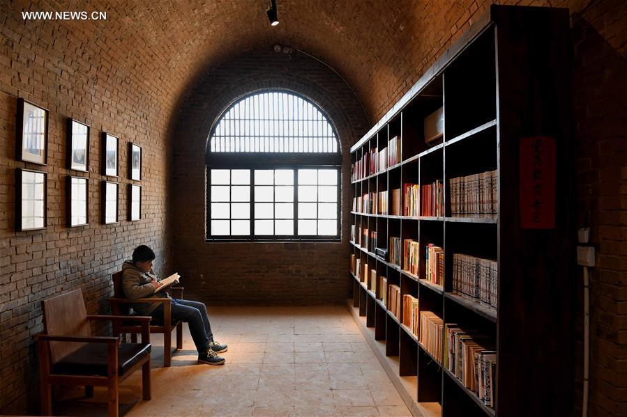 A child reads books at a cave dwelling library in Mogou Village of Mengzhou City, central China's Henan Province, Jan. 19, 2017. The cave dwelling library, covering an area of about 4,000 square meters, comprises more than 50,000 volumes. It is opened to the public for free. (Xinhua/Li An)