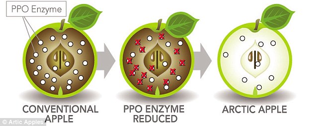 The gene that causes browning in the apple has been silenced in Arctic Apples, meaning they don't go brown from being sliced open but from actual rotting. The enzyme polyphenol oxidase (PPO) starts a chemical reaction called oxidative browning, causing the apple to turn brown, and PPO is absent in Arctic Apple's because of the silenced gene. However, according to information on the Arctic Apples websites, PPO plays a role in defending against pests and pathogens.