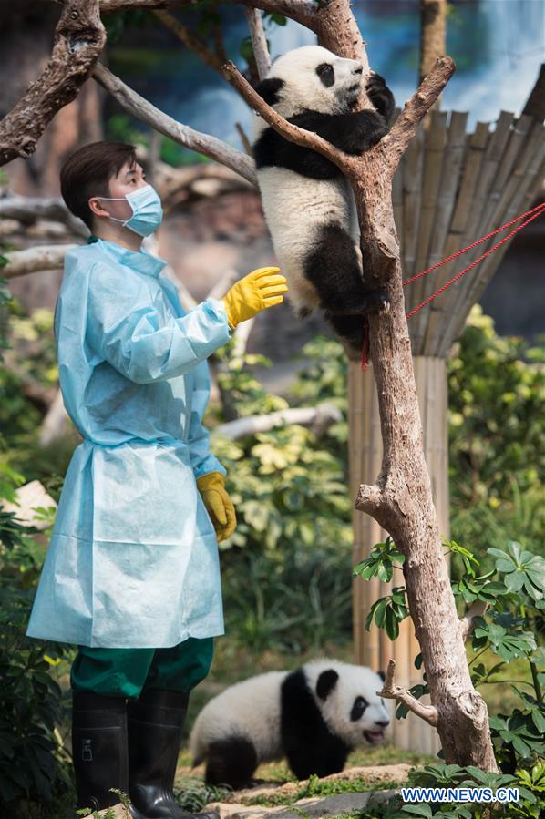 Panda cubs "Jianjian" (Up) and "Kangkang" play at a zoo in Macao, south China, Jan. 27, 2017. Seven-month-old twin panda cubs "Jianjian" and "Kangkang" and their keepers met the media here, on the eve of the Spring Festival. [Photo: Xinhua]
