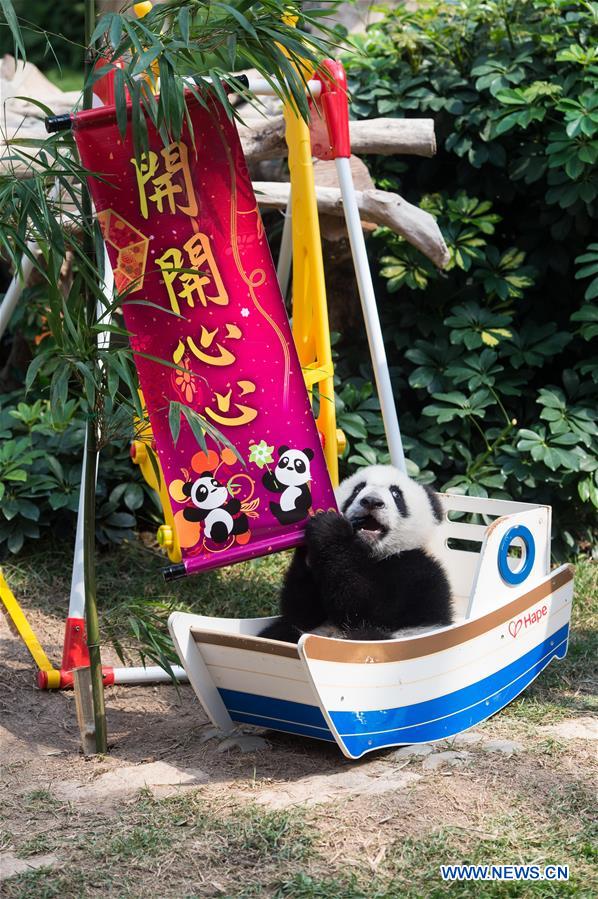 Panda cub "Kangkang" plays at a zoo in Macao, south China, Jan. 27, 2017. Seven-month-old twin panda cubs "Jianjian" and "Kangkang" and their keepers met the media here, on the eve of the Spring Festival. [Photo: Xinhua]