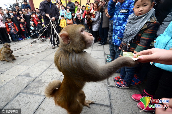 A street performer put on a look of pain after being kissed by his monkey during a street show. On Thursday, a temple fair was held to celebrate the Spring Festival in Xuchang city in central China's Henan province. Besides from the kiss, the monkey performed some acrobatic tricks. When the show was over, the monkey took money from the audience's hands and shook hands with the crowd of onlookers to express gratitude.