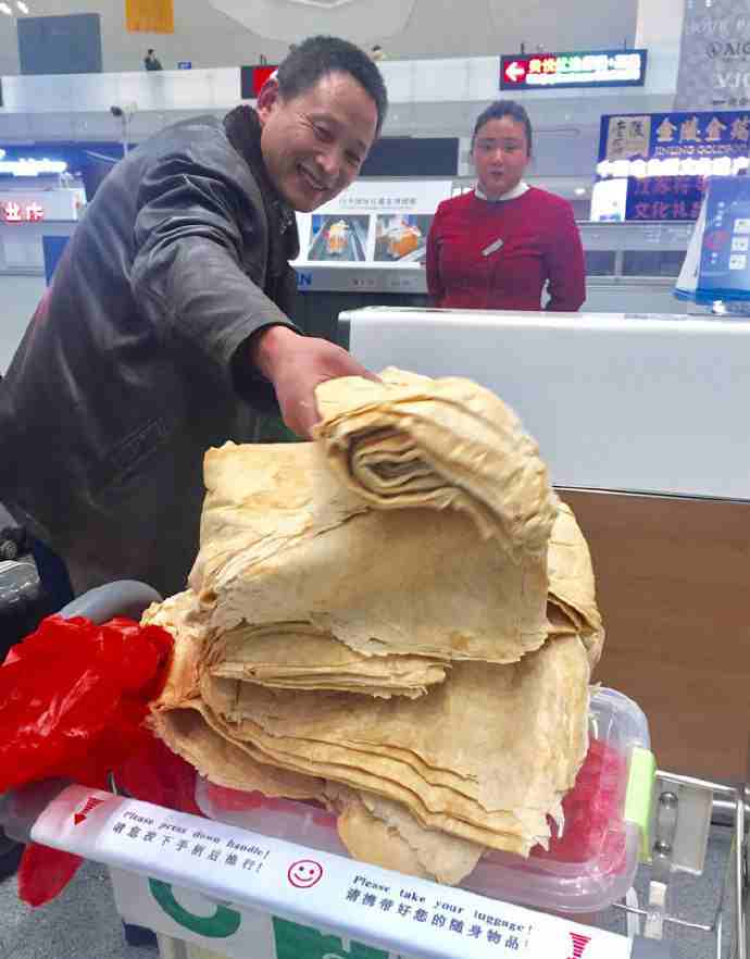 The flatbreads were made by Zang’s mother, who is in her 70s and lives in Shandong province, during the Spring Festival holiday. Knowing how much Zang enjoys her homemade Shandong bread, she spent over three hours preparing more than 100 rounds of the snack, and packed many extras for him to bring back to Chengdu. Besides the flatbreads, other local specialties also weighed down Zang’s luggage.