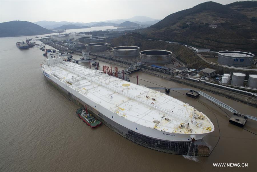The supertanker TI Europe is seen at a berth in Daxie port zone of Ningbo-Zhoushan Port in Ningbo, east China's Zhejiang Province, Feb. 16, 2017. The ship TI Europe left the port after offloading work on Thursday. Designed to cater to 450,000 deadweight tonnage tankers, the berth is Asia's largest crude oil terminal. (Xinhua/Huang Zongzhi)