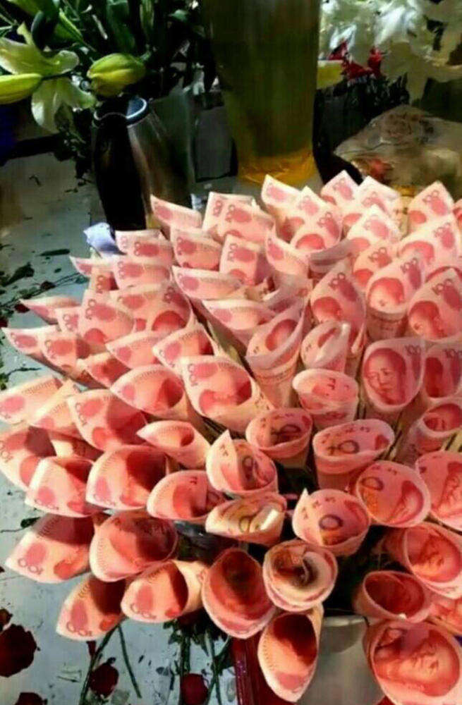 On Feb. 13, 2017, a man from Changchun, Jilin province sent his girlfriend a "bouquet" made from 100 100-RMB banknotes. With the bouquet, the man wished his girlfriend good luck in the new year.