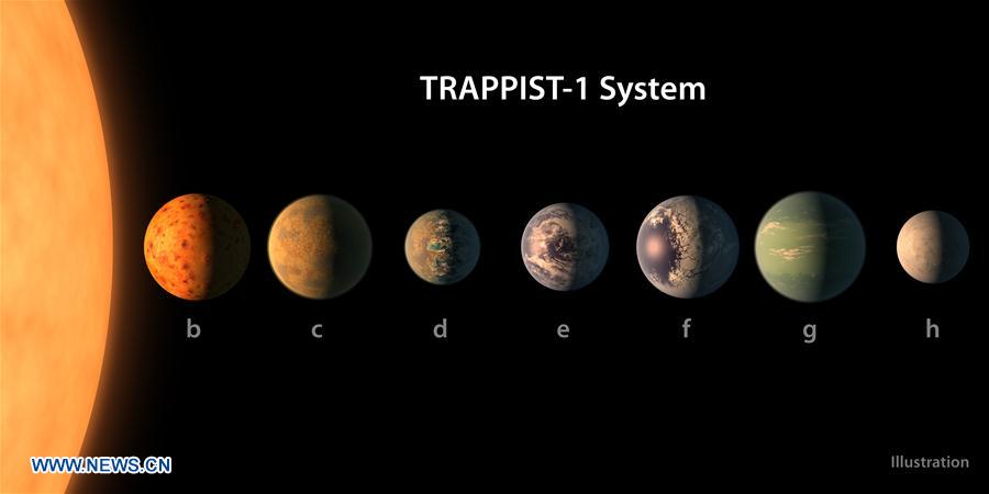 The illustration released by NASA on Feb. 22, 2017 shows the artist's concept of what the TRAPPIST-1 planetary system may look like, based on available data about the planets' diameters, masses and distances from the host star. A compact analogue of our inner solar system about 40 light years away from the Earth has been discovered, NASA announced during a press conference on Wednesday. An international team of astronomers using powerful space telescopes and ground-based observatories have discovered the first known system of actually seven Earth-sized planets orbiting the nearby TRAPPIST-1, which is relatively close to us, in the constellation Aquarius. And three of these planets are firmly located in the habitable zone, the area around the parent star where a rocky planet is most likely to have liquid water. (Xinhua/NASA/JPL-Caltech)