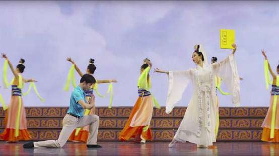 The dancer in white holding the “Bible”of Falun Gong appeared as a bodhisattva