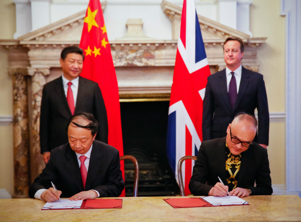 Witnessed by Chinese President Xi Jinping and U.K. then-Prime Minister David Cameron, China’s CITIC Construction signed a deal to become general contractor of China's New Financial District in London, Oct 21, 2015.