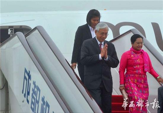 Myanmar President U Htin Kyaw (front, left) arrives in Chengdu, capital of southwest China's Sichuan province, on April 6, 2017. [Photo: huaxi100.com]