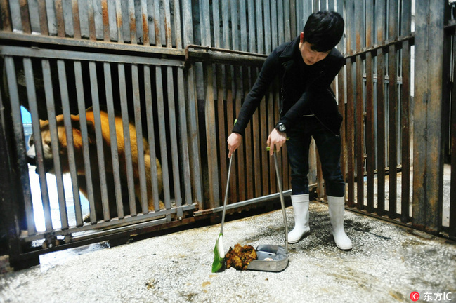 A visitor cleans up poop in the polar bears' enclosure at the Haichang Polar Ocean World Park in Wuhan, capital of central China's Hubei province, April 6, 2017. [Photo: IC]