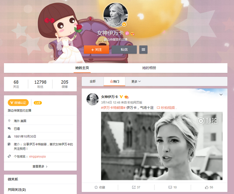 Ivanka inspires many young Chinese. On Weibo, China’s equivalent of Twitter, there is even an online fan club dedicated to “Goddess Ivanka.” The online fan club has close to 13 thousand followers. One post shows a photo of Ivanka sitting between her father and Canadian Prime Minister Justin Trudeau at the Oval Office Desk. In the comments section a Weibo user wrote, “Don’t become president, you’re a good princess.”