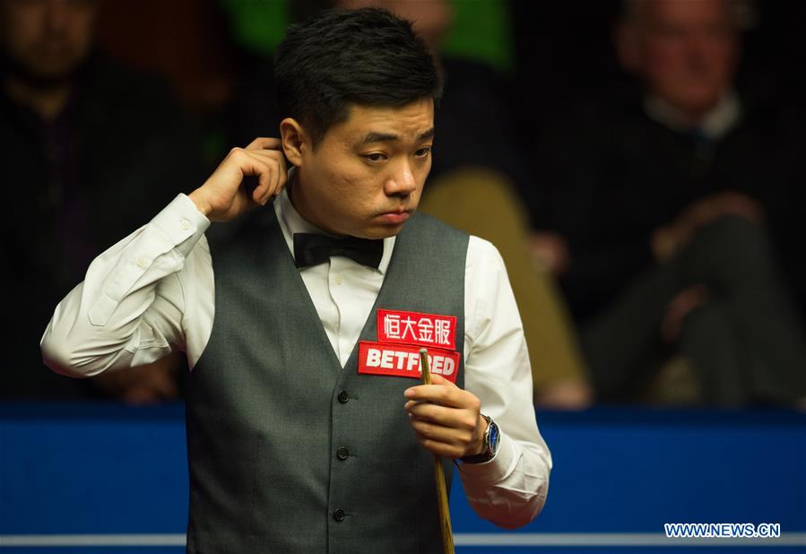Ding Junhui of China competes in the third session of the semifinal against Mark Selby of England during the World Snooker Championship 2017 at the Crucible Theatre in Sheffield, Britain on April 28, 2017. (Xinhua/Jon Buckle)