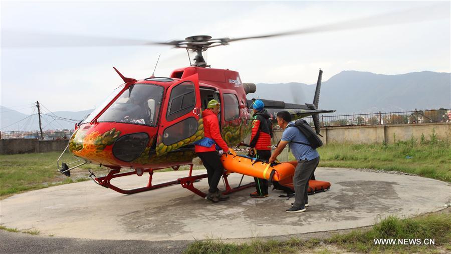 The body of famous Swiss climber Ueli Steck known as "Swiss Machine" is brought by a helicopter at Teaching Hospital in Kathmandu, Nepal on April 30, 2017. Famous Swiss climber Ueli Steck, popularly known as "Swiss Machine," died on Sunday as he fell to the foot of Mount Nuptse, Nepalese officials and expedition organizing company said. (Xinhua/Sunil Sharma)
