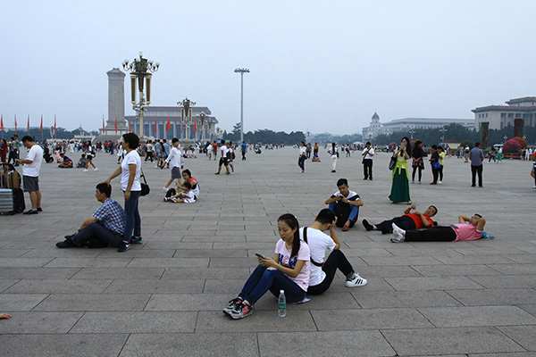 Many young people read in the square in the 1980s. Nowadays, they tend to play with their smart phones instead.