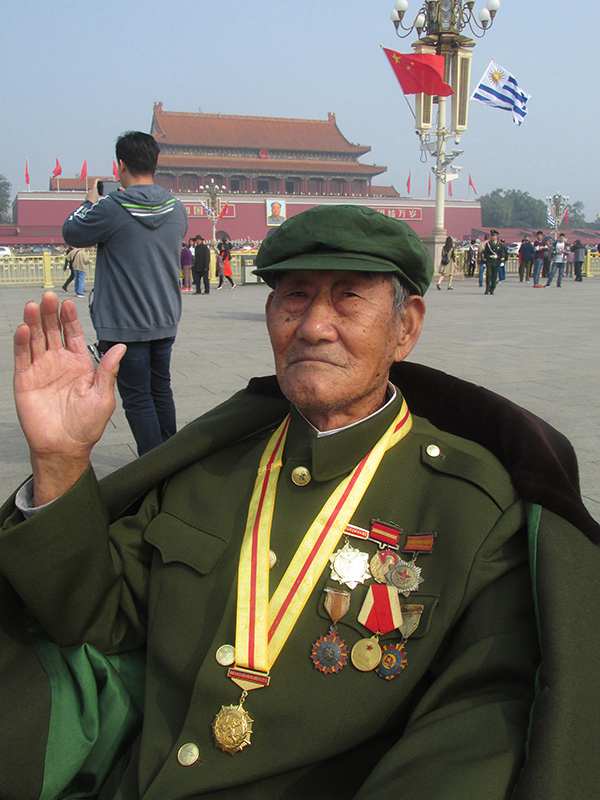 A veteran who had fought in the War of Chinese People's Resistance Against Japanese Aggression had his photo taken in front of Tiananmen in a wheelchair.