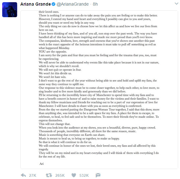 Grande's new post, which has been retweeted 265,000 times, said that the attack will not change her original intention for the Dangerous Woman Tour, which was to make the show “a safe place for my fans. A place for them to escape, to celebrate, to heal, to feel safe and to be themselves. To meet their friends they’ve made online. To express themselves.”