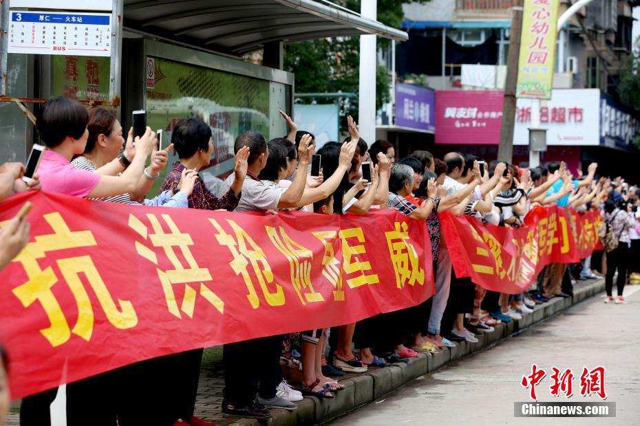 Over 1,000 residents took to the streets on Thursday to bid farewell to soldiers who were about to leave after 100 straight hours of fighting floods in Lanxi City, south China’s Zhejiang province. Rain-triggered floods have affected many places in the province.