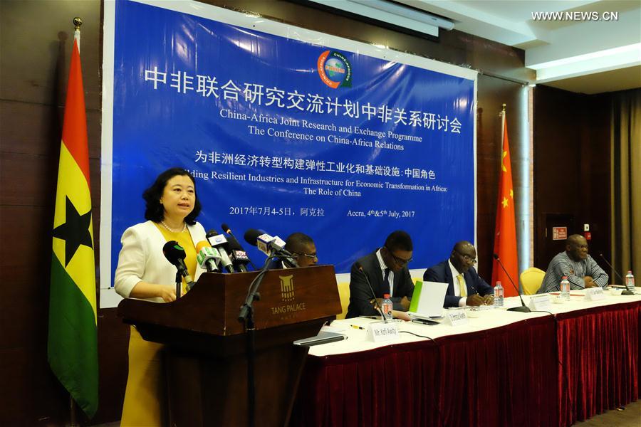 Chinese Ambassador to Ghana Sun Baohong delivers a speech at a conference on China-Africa relations in Accra, capital of Ghana, on July 4, 2017. China will not be a proselytizer and instead supports Africa's pursuit of development paths suiting its own situations, Chinese Ambassador to Ghana Sun Baohong said Tuesday. (Xinhua/Shi Song)