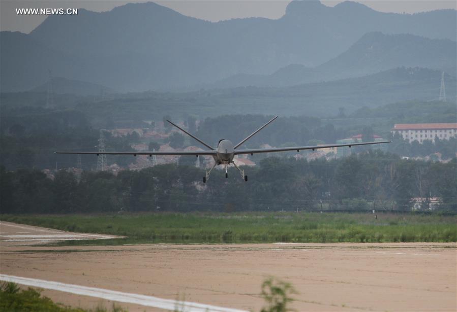 The mass-production model of China's unmanned aerial vehicle CH-5, or "Caihong (Rainbow) 5", prepares to land in an airport after its trial flight in north China's Hebei Province, July 14, 2017. Introduced at an international airshow in the southern Chinese city of Zhuhai last year, the CH-5 can conduct reconnaissance, surveillance, patrol, target positioning and strike missions, according to its developer. (Xinhua/Bai Guolong)